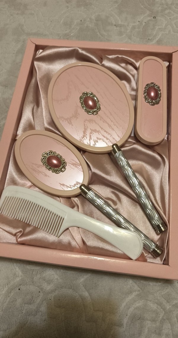 İnci ve metal detaylı iki el aynası, bir tarak ve uyumlu kutudan oluşan vintage tarzda saç bakım seti. Saten kaplı kutuda sunulur. ♀️