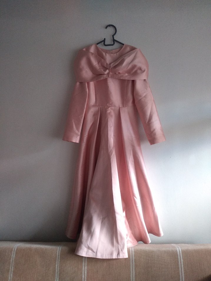 Pembe uzun kollu, drapeli ve yakalı bu klasik vintage tarz elbise, düğünler için şık ve zarif bir seçimdir. pudra pembe omuzdan etek ucuna uzunluk 135 cm özel dikimdir