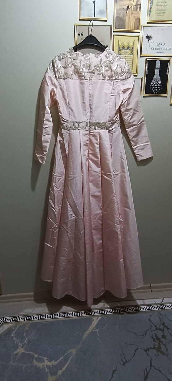 Pembe renkte, uzun kollu, drapeli ve oturan kesime sahip vintage tarzda uzun kadın elbisesi. Notlu yaka detayı ile düğünler için uygun şık bir model. bir kere giyildi sorunu yoktur sözümde kullandim