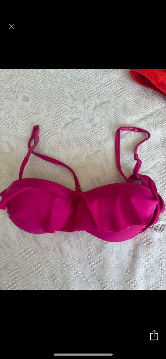Pembe, askılı, volan detaylı ve vücuda oturan bikini üstü, renkli ve bohem tarzda plaj için ideal.