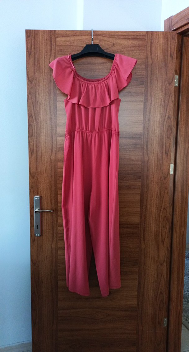 Pembe renkli, volan detaylı, straplez yaka ve kolsuz uzun kadın tulumu. Rahat kesimi ve yumuşak sentetik kumaşıyla minimalist bohem tarzını yansıtır. Günlük kullanıma uygundur.