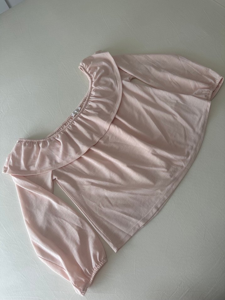 Kayık yaka ve volan detaylı, bol kesim pembe kadın bluz. Sentetik kumaştan, uzun kollu ve günlük kullanıma uygun.