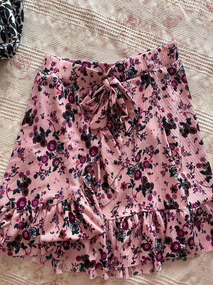 Pembe renkli, volan detaylı, çiçek desenli, bol kesim mini etek. Yumuşak sentetik kumaştan üretilmiştir. Romantik buluşmalar için uygundur.