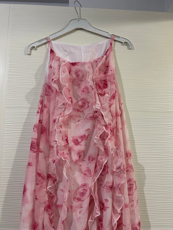Kolsuz, bol kesim, pastel pembe batik desenli uzun elbise, volan detaylarıyla düğün için uygun.