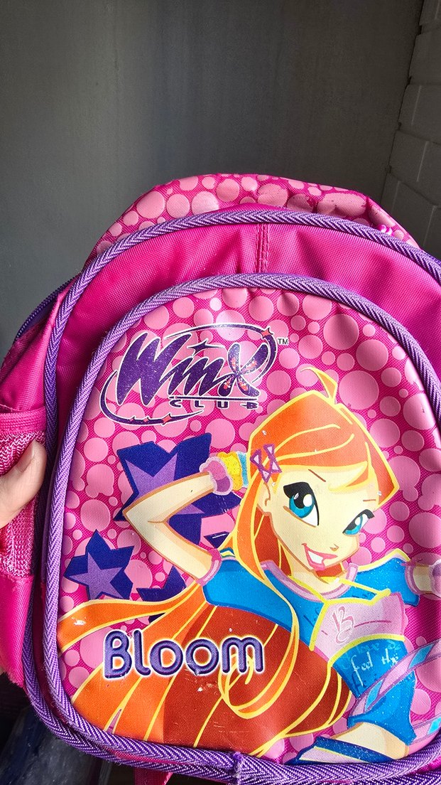 Canlı pembe renkte, önünde Bloom karakteri bulunan Winx okul çantası, çok bölmeli ve mor fermuarlı.