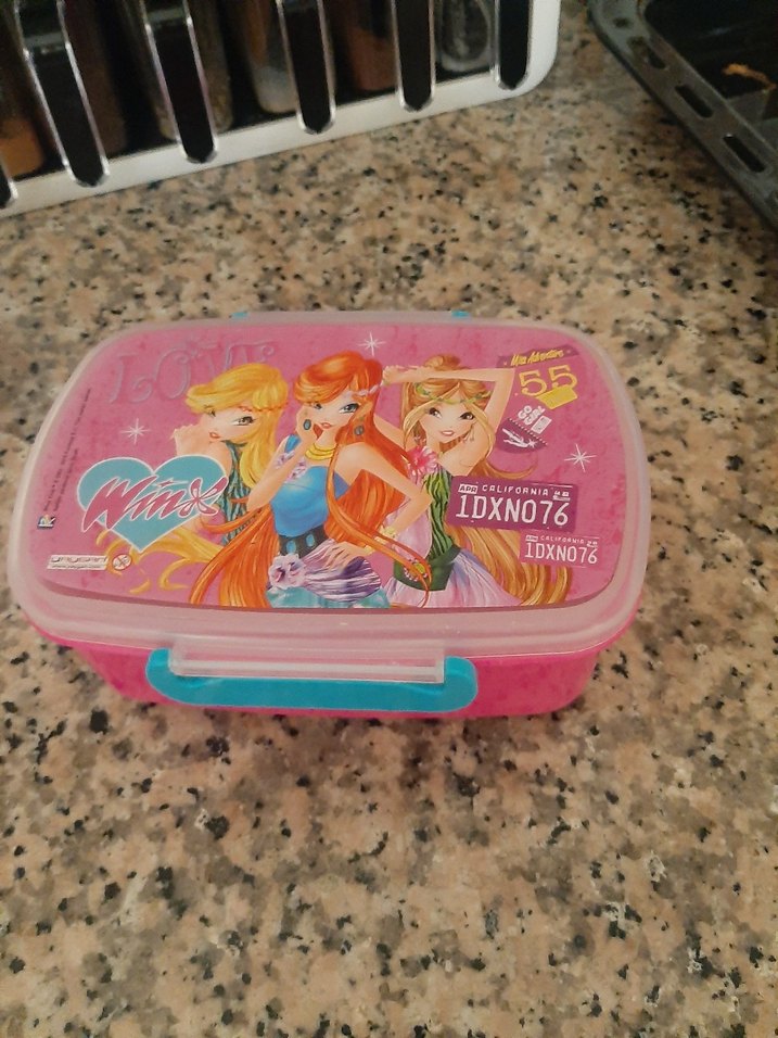 Pembe renkte, kapağında Winx karakterleri bulunan, mavi kilidiyle güvenli çocuk beslenme kabı.
