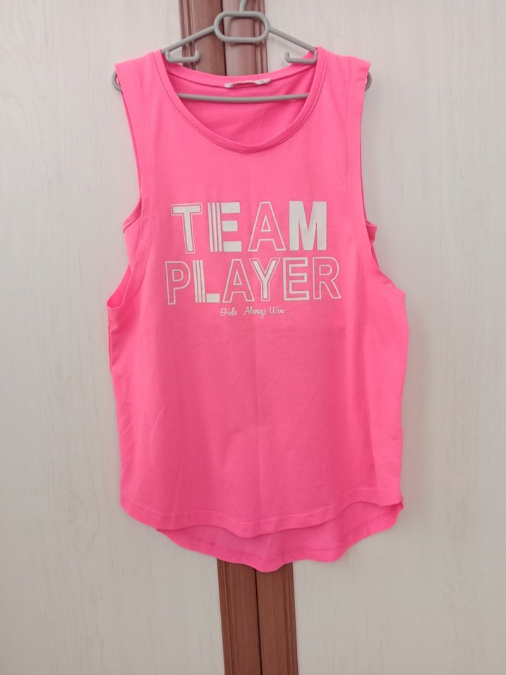 Rahat kesim pembe kolsuz kız çocuk tişörtü, renkli baskılı 'TEAM PLAYER' yazısı ve iç atlet detaylı,kolsuz sporcu atleti .yeni gibi temiz