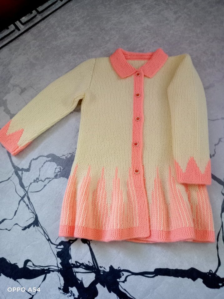 Uzun kollu, bol kesim örme hırka, pastel pembe yakası ve detaylarıyla bohem tarzda, düğmeli ön kapamalı. Ölçüler fotoğrafta mevcuttur.