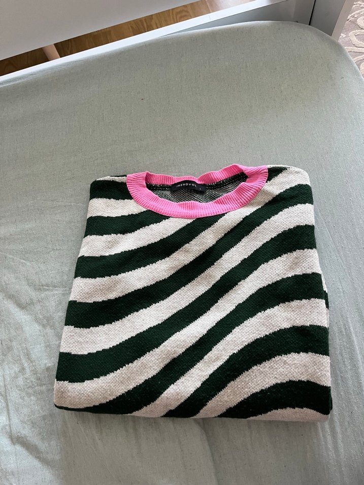 Gri-haki zebra desenli, pembe yuvarlak yakalı kadın kazak. Sentetik kumaştan örülmüş, uzun kollu ve rahat kesim. Bazı yerlerinde pamuklanmalar var onun dışında tertemiz ürün