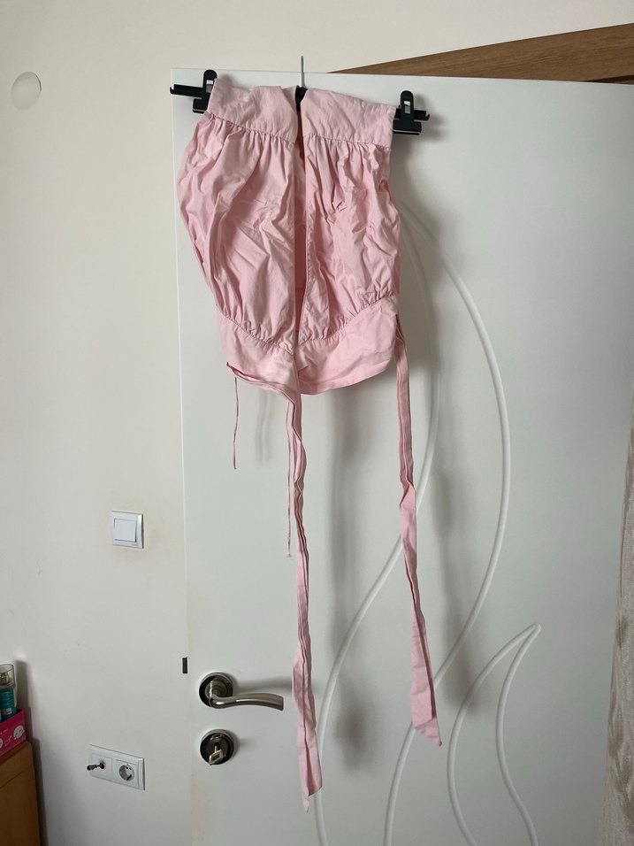 Pembe renkte, kısa ve mini boyda, vücuda oturan hemşire korsesi. Uzun bağcıklarla ayarlanabilir ve düz desensizdir.