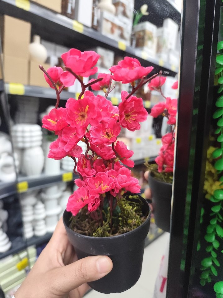 Canlı pembe yapay çiçeklerle süslü mini saksı, yeşil yosun tabanlı ev dekorasyonu için uygun.