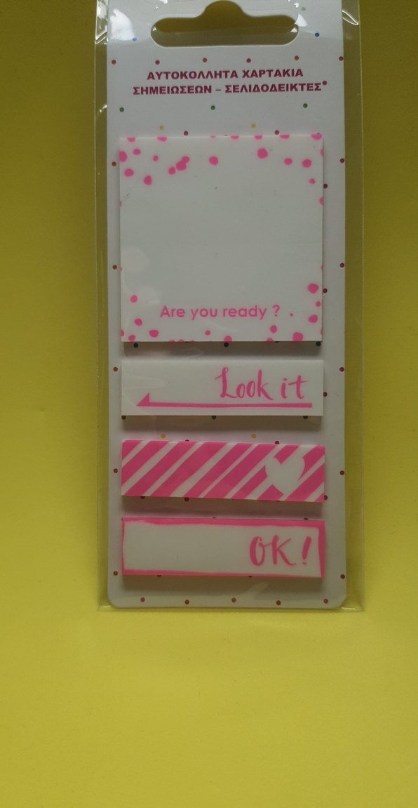 Pembe açık tonlarında "Look it", "Are you ready?" ve "OK!" yazılı yapışkan notlar seti. Hızlı notlar için uygundur.