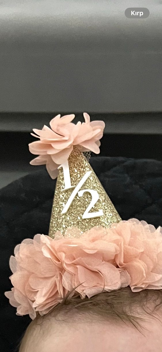 Bu parti şapkası, yarım doğum günü için ışıltılı altın koni ve açık pembe kumaş çiçeklerle süslenmiştir.