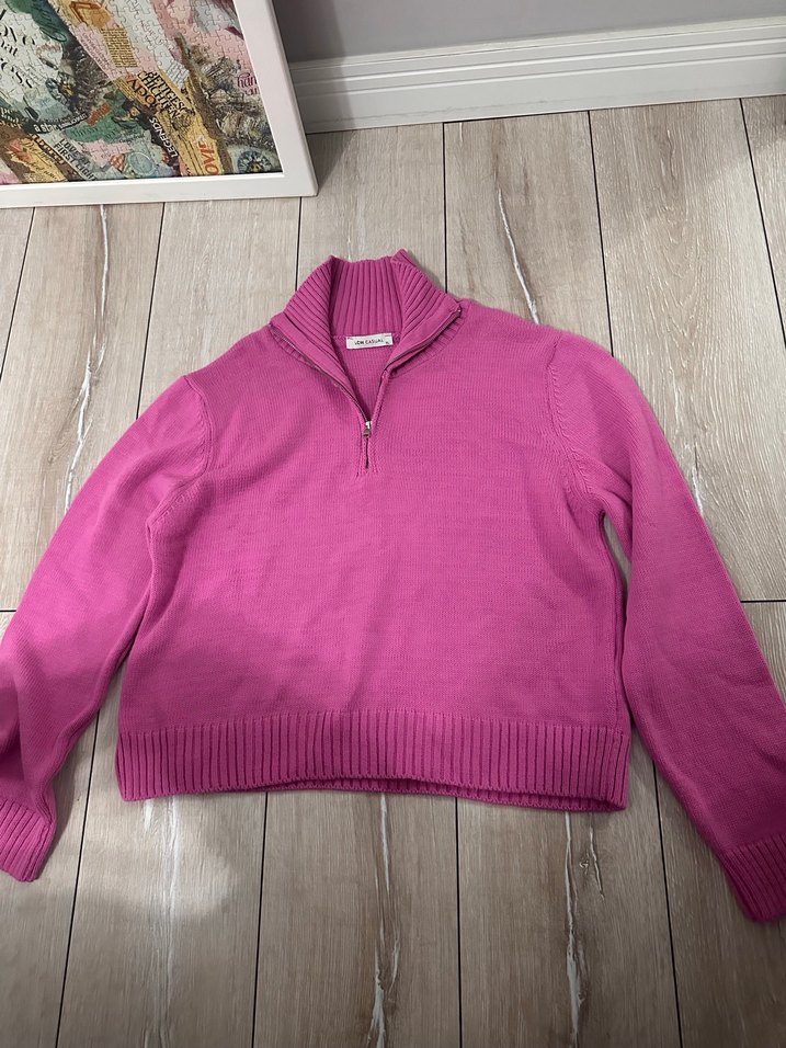 Pembe renkte, yarım fermuarlı yüksek yakalı, uzun kollu ve normal uzunlukta bol kesim triko kazak. Günlük kullanım için uygundur.