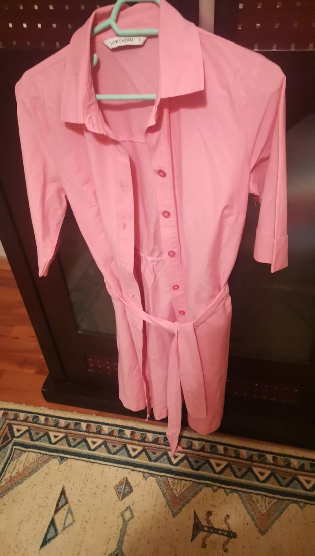 Pembe renkte, uzun kollu ve düğmeli kadın elbise. Notlu yaka ve kuşaklı, regular kesim, sokak stiline uygun rahat bir tasarım. Pastel tonlarda, sentetik kumaştan.