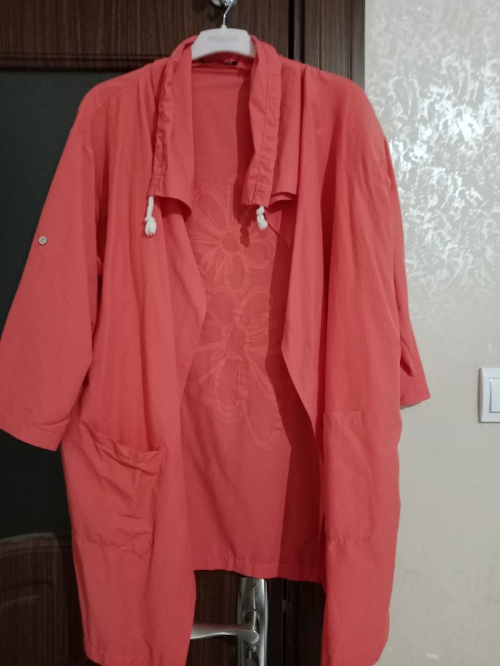 Pembe, parlak renkte yarım kollu, salaş kesim, cepli ve bağcıklı yakalı kısa boy ceket