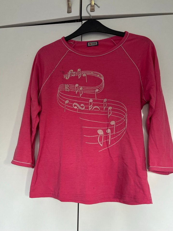 Pembe renkli, uzun kollu ve yuvarlak yakalı tişörtü. Pamuklu kumaştan, bol kesim ve müzik notası baskılıdır. sportif tarzda kullanıma uygundur. Resimde görüldüğü gibi leke mevcut onun dışında herhangi bir sorun yoktur