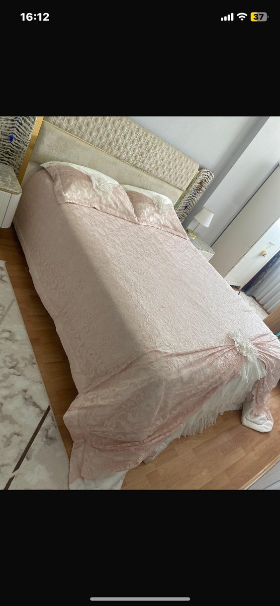Az kullanılmış tamamen dantel üzeri saten üzerine yapılmış çift kişilik çift yastıklı çok güzel sadece görüntü için kullanıldı kısa bir süre  ufak tefek deformeleri var iç tarafta çamaşır makinasından kaynaklı