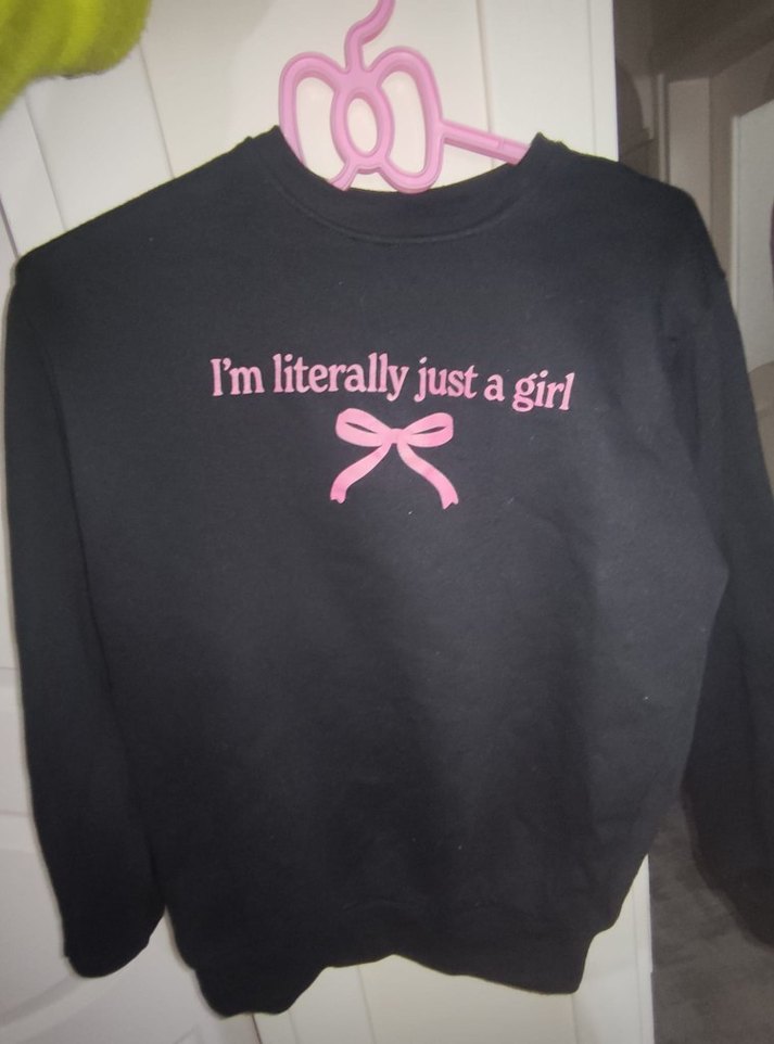 Uzun kollu, kadın sweatshirtü., pembe fiyonk ve "I'm literally just a girl" yazısı ile süslenmiştir kargo bedavadeğil.