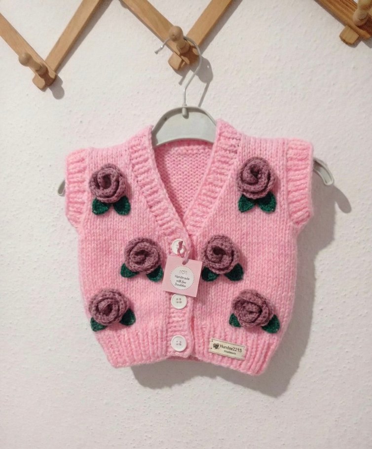 Kız çocuklar için pastel pembe renkte, nakışlı mor güllerle süslenmiş, yumuşak örme kumaştan yapılmış, fitted kesim kolsuz süveter.