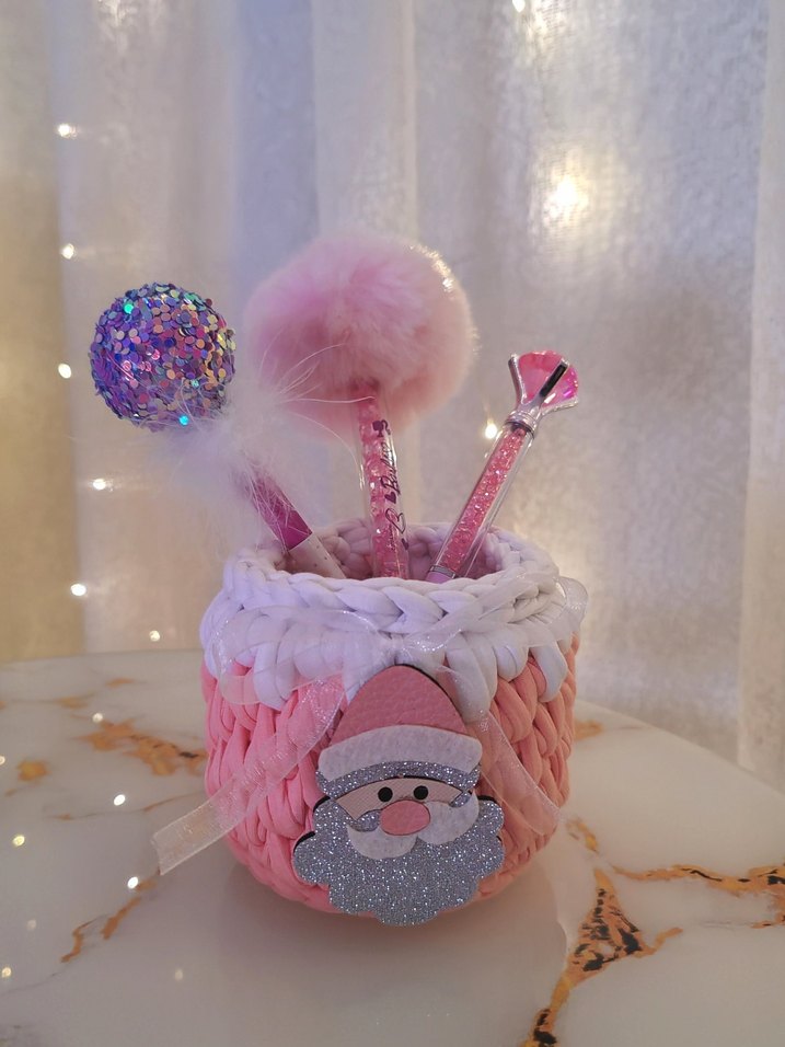 Renkli pembe kalemlik sepeti, üzerinde Noel Baba süsü ile, simli ve tüylü kalemler içerir.