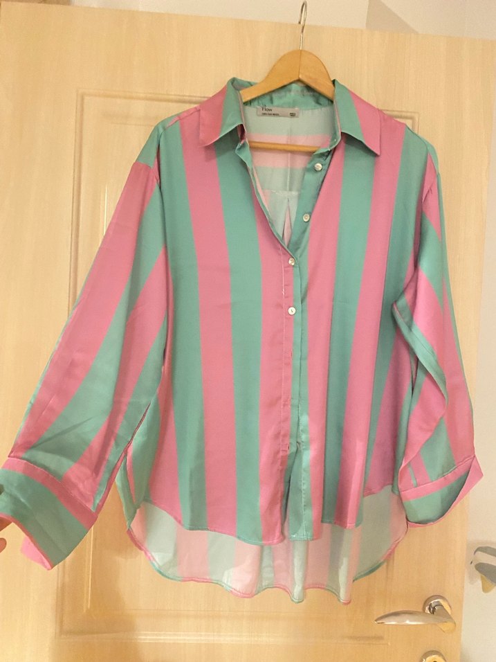 Bol kesim, uzun kollu düğmeli saten gömlek. Pembe ve yeşil pastel çizgilerle, ipeksi kumaştan, V yakalı, günlük rahat stil için uygun.Hiç kullanılmadı.