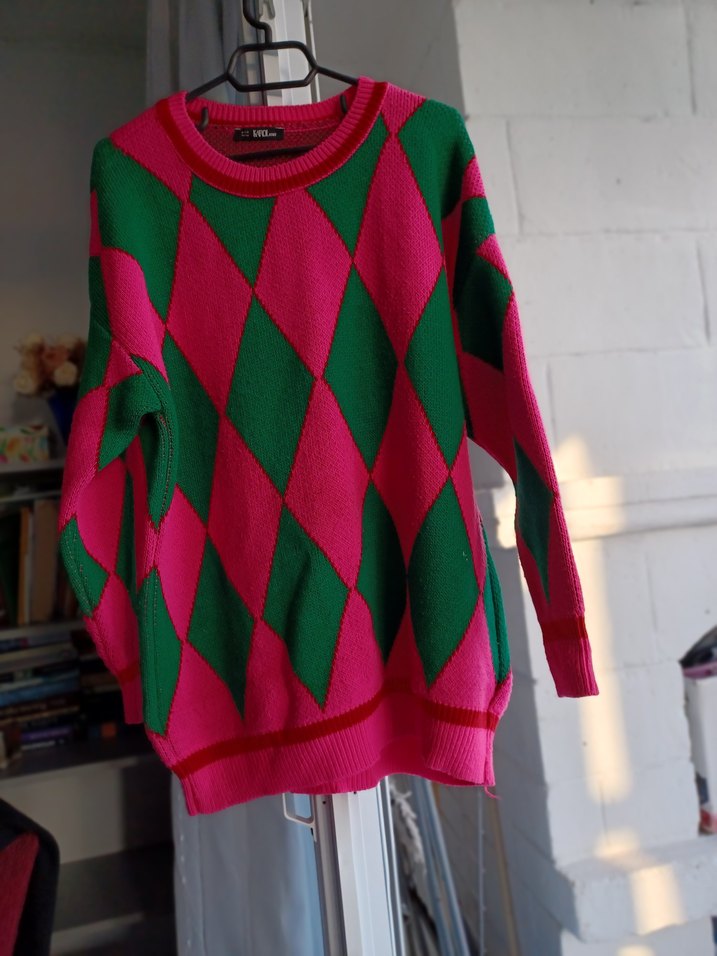 Rahat kesim, uzun kollu kadın kazak; pembe ve yeşil renklerde örgü el işi desenlidir. Bohem ve günlük kullanıma uygundur.