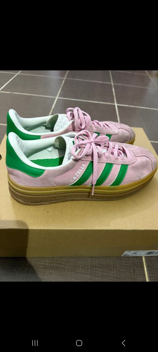 Pembe Adidas Gazelle spor ayakkabı, yeşil şeritler ve platform kauçuk taban ile sportif ve sokak stili sunar. site güncel fiyatını ekledim en son resime çok şık güzel bir ayakkabı 41 ve 41 ,5 a çok rahat olur
