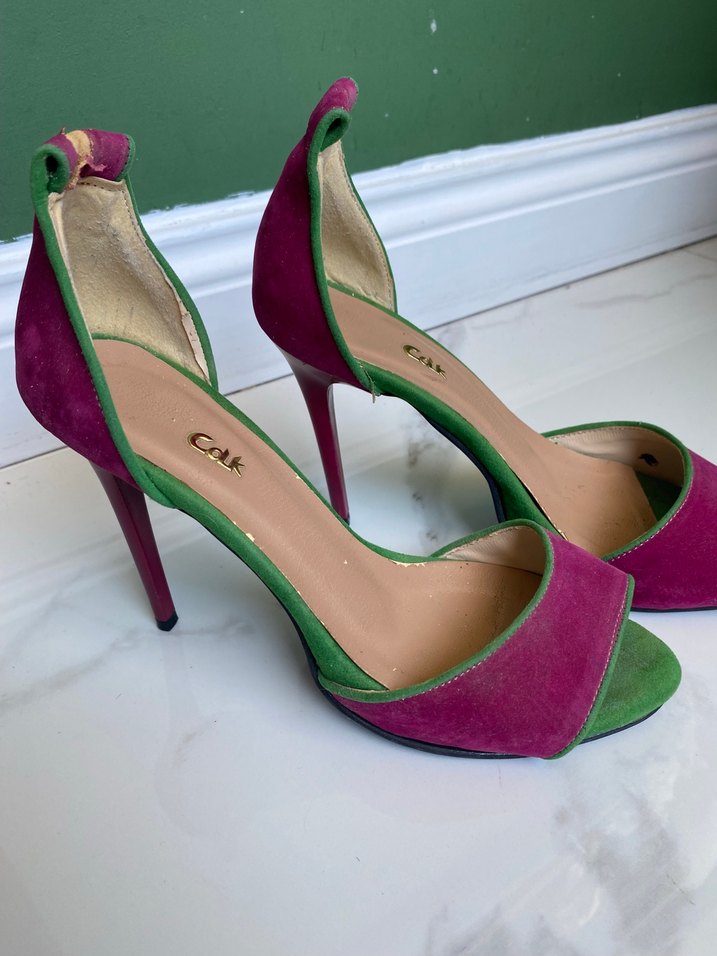 Kadın abiye ayakkabılar süet malzemeden üretilmiş, stiletto topuklu ve pembe-yeşil renklerde. Tokalı detaylarıyla romantik akşamlar için uygun. İpleri deforme olduğu için çıkarttım,birkaç defa giyildi şuan giyilmediği için satıyorum.görüldüğü üzere sadece bir ayakkabının üst kısmı deforme olmuş durumda.İç kısımda gözüken ufak soyulmalar ayakkabı giyildiğinde gözükmüyor.