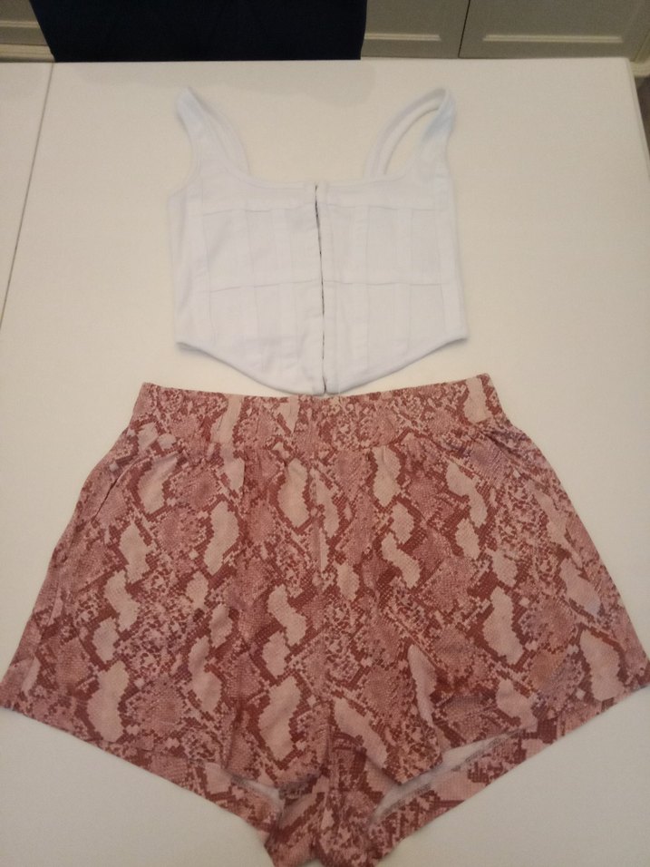 Sentetik kumaştan yapılmış, pembe yılan derisi desenli ve dantelli, dar kesim mini şort. Günlük sokak stili için uygun.