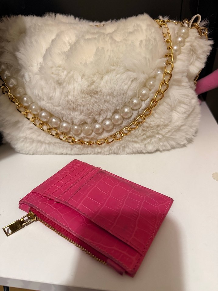 Pembe, parlak yılan derisi desenli cüzdan, fermuarlı ve beyaz kürk detaylı çantayla uyumlu inci ve altın zincir aksesuarlar içerir.