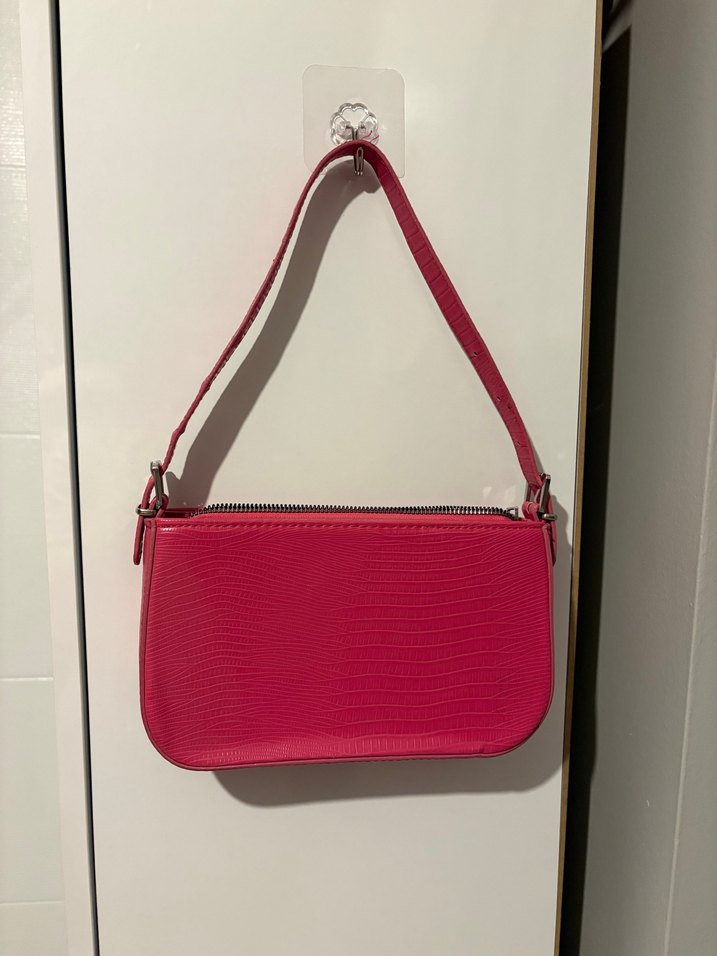 Parlak pembe renk, yılan derisi desenli deri kadın çanta, fermuarlı kapanışlı, cesur sokak stili için uygun.