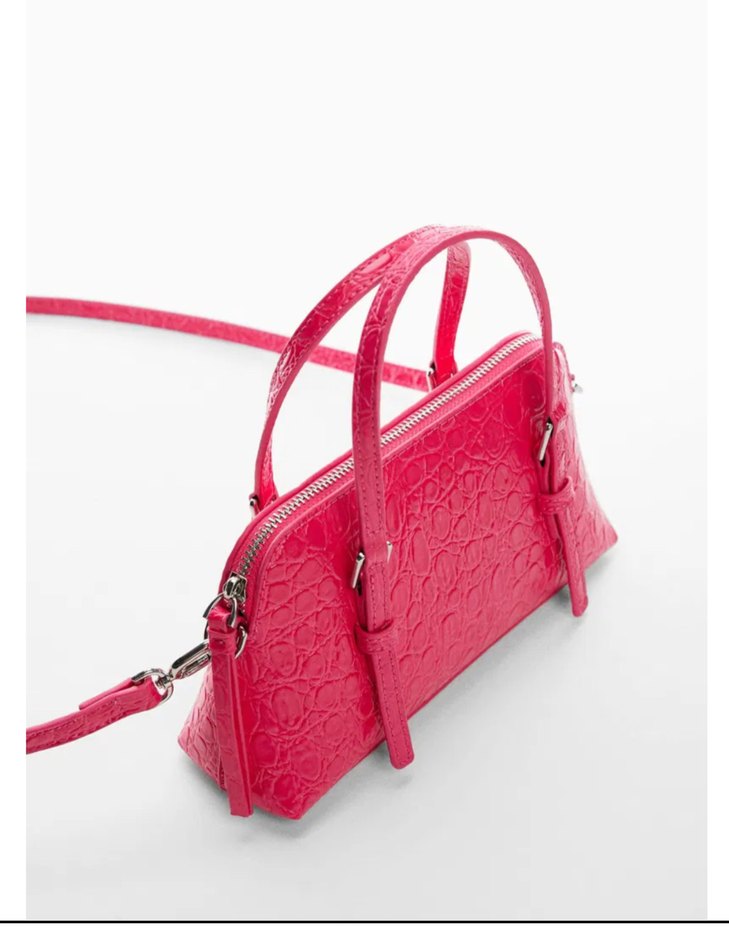 Pembe yılan derisi desenli deri çanta, fermuarlı ve çağdaş tasarıma sahip. Günlük kullanıma uygun, minimal ve trend bir şıklık sunar.