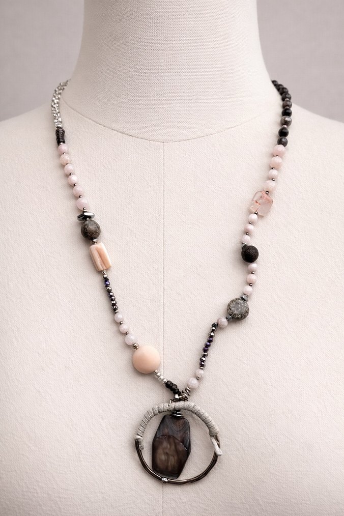 Pembe boncuklar ve yılan desenli detaylara sahip uzun bohem tarzda kadın kolye. Gri ve siyah boncuklarla birleşen benzersiz bir kolye ucu içerir.