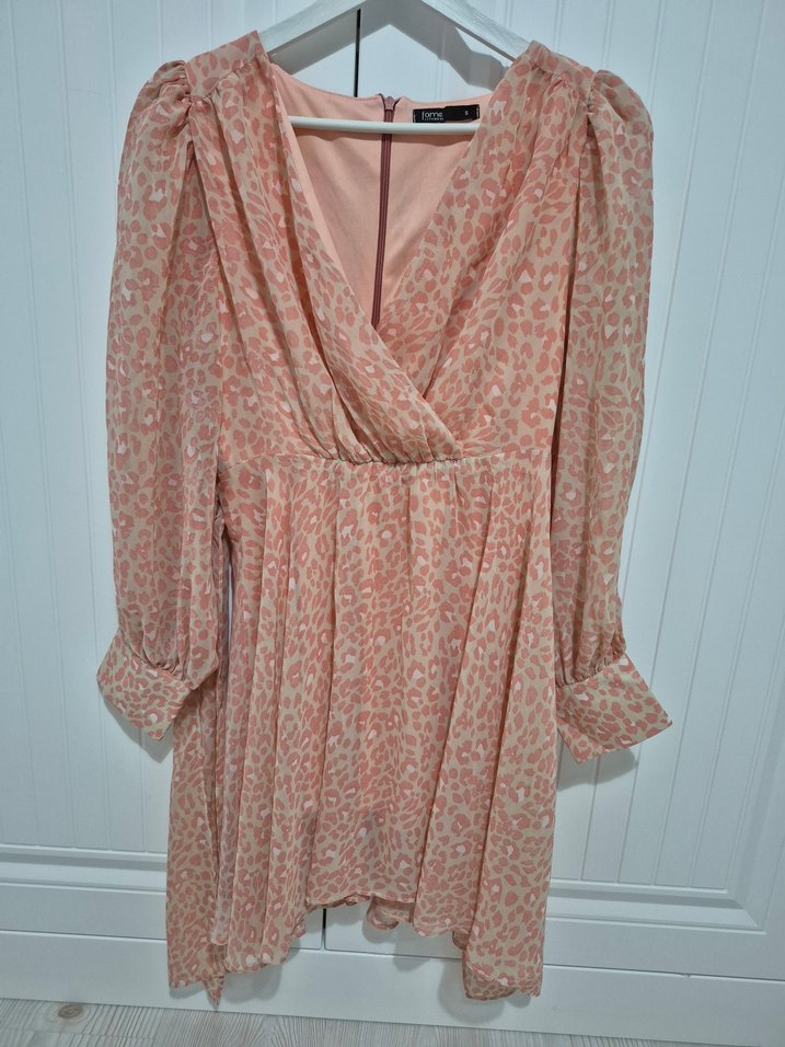 Pembe pastel yılan desenli, uzun kollu ve fit kesim bohem tarzda kısa elbise. Hafif ve akışkan kumaştan üretilmiştir.