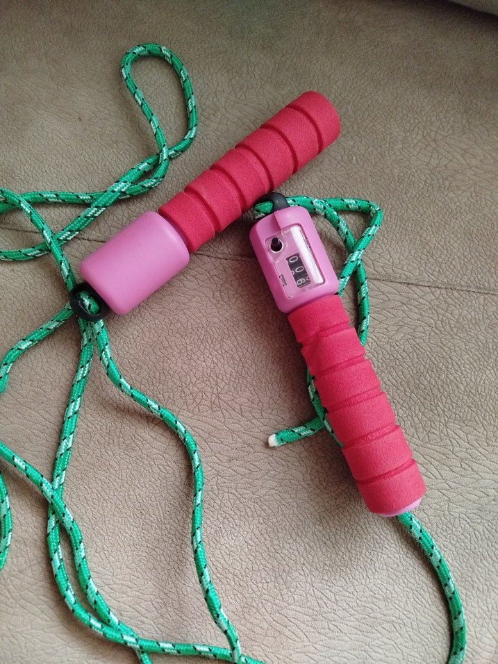 Pembe yılan desenli ve sayıcı özellikli saplara sahip, renkli yeşil ipli atlama ipi.