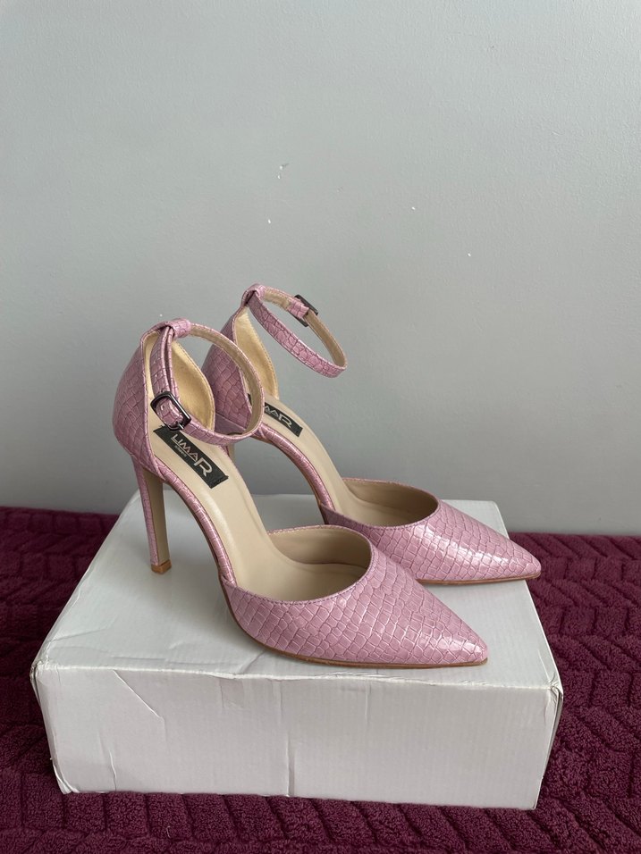 Pembe yılan desenli stiletto topuklu, tokalı bilek kayışlı kadın ayakkabısı. Kauçuk malzemeden, ofis için çağdaş ve zarif tarzda uygun.