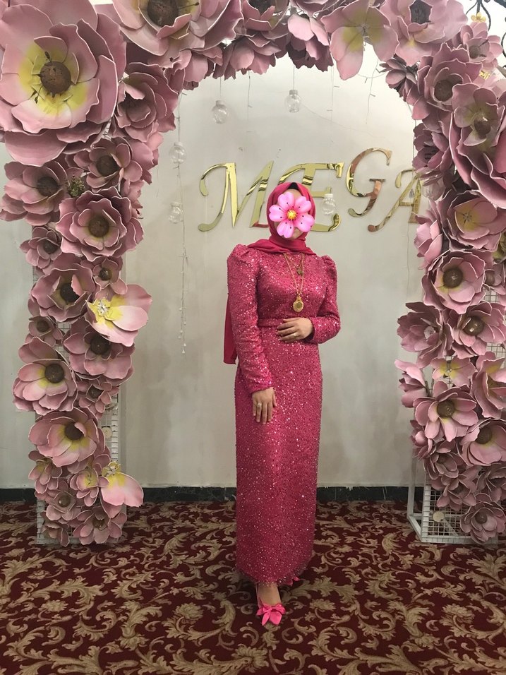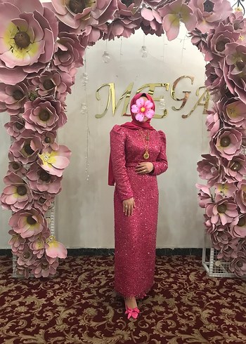 Pembe yılan desenli uzun, dar kesim abiye elbise. Yüksek yakalı ve uzun kollu, drapeli detaylara sahip, düğünler için uygun. 36 ve 38 bedenlerde tercih edebilir . Boy 157 kilo 56 da giyildi