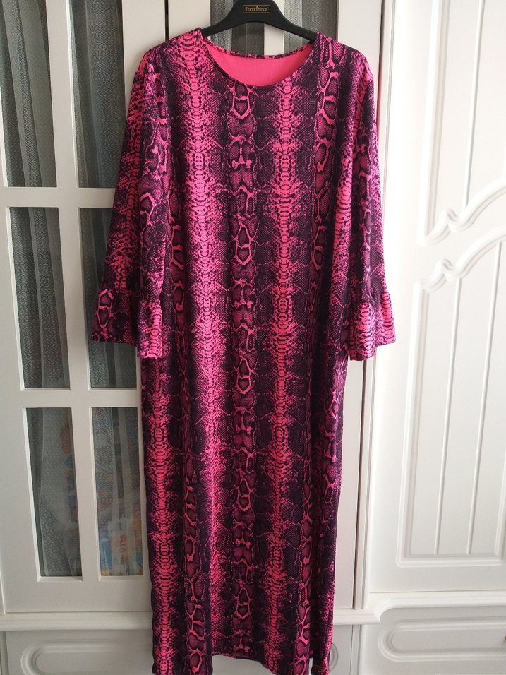 Pembe Yılan Desenli Uzun Kollu Uzun Elbise