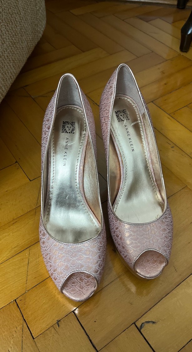 Dantelli, parlak yılan desenli pembe yüksek topuklu saten ayakkabılar, düğünler için uygundur. Marka: Anne Klein.