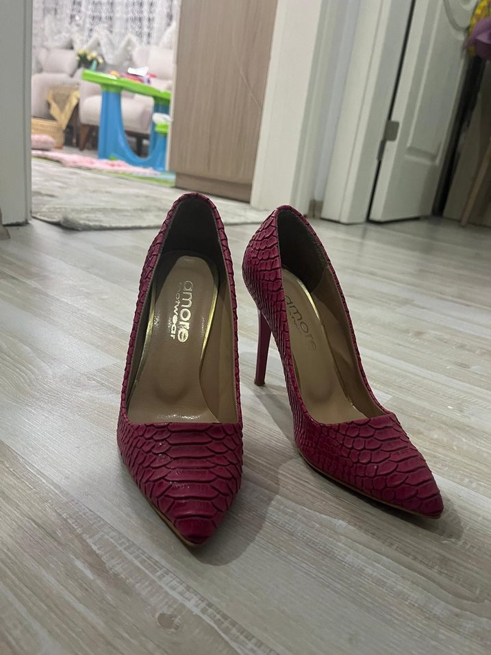 Pembe, parlak yılan desenli deri stiletto, dantel detaylarıyla romantik akşamlar için uygun. ✨
