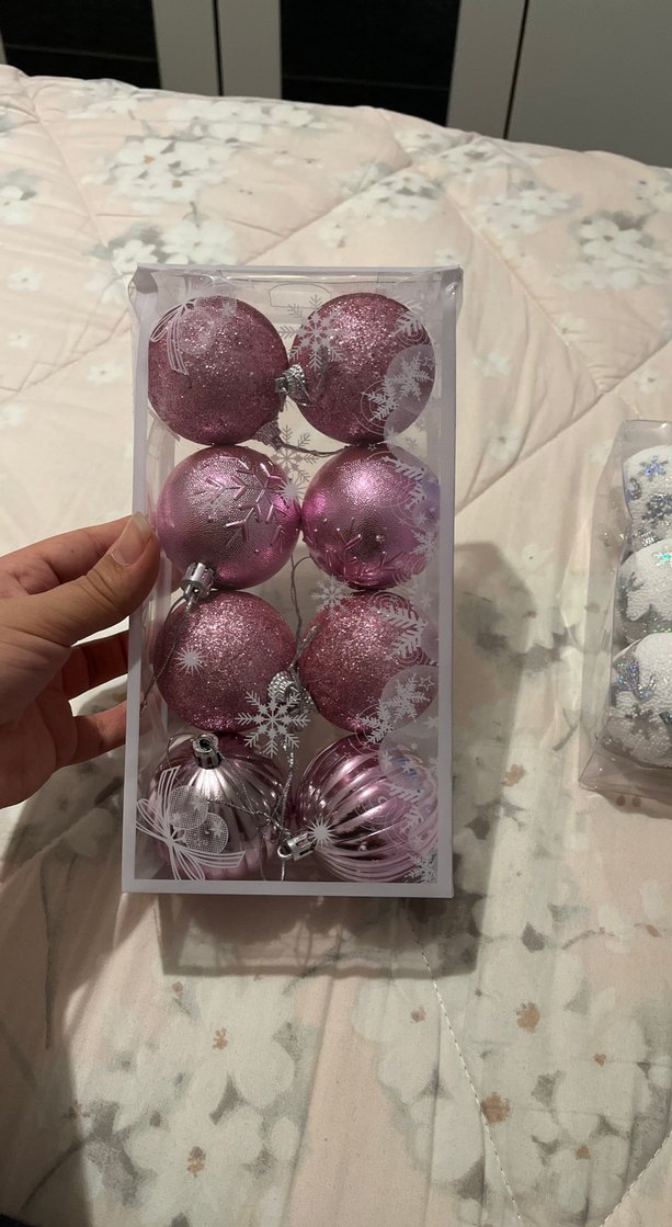 Farklı parlak ve mat dokularda 8 adet açık pembe yılbaşı süsü seti.