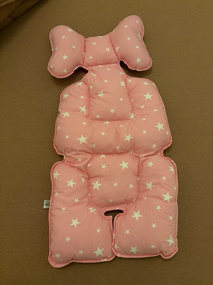 Pastel pembe renkte, beyaz yıldız desenli yumuşak sentetik kumaştan yapılmış bebek minderidir. Bebek arabasına uygun minder az kullanıldı sorunsuz