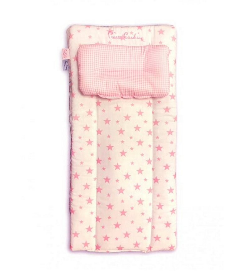Pastel pembe yıldız desenli, yumuşak ve konforlu bebek uyku minderi ve kareli yastık içerir.