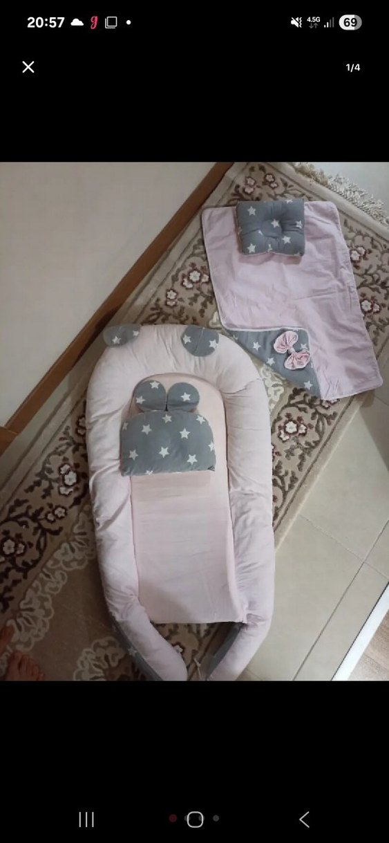 Yumuşak ve sıcak kumaştan yapılmış, pastel pembe ve gri yıldız desenli bebek uyku seti; minder, yastık ve battaniye içerir.