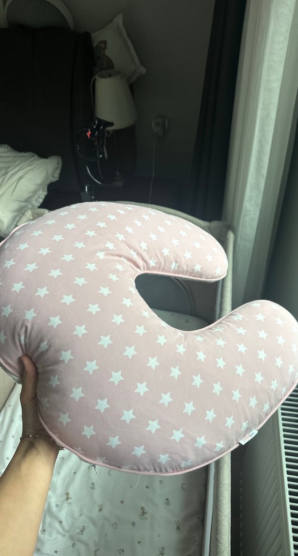 Pastel pembe renkte, beyaz yıldız desenli emzirme ve hamile yastığıdır. Rahat kullanım sağlar. Az kullanılmış tertemizdir