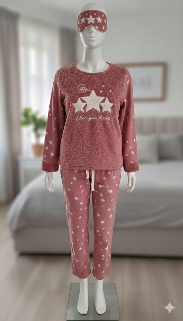 ✨ Kumaş ve Doku: Birinci sınıf Welsoft/Polar kumaştan üretilmiştir. Bulut gibi yumuşak dokusuyla kış gecelerinde sizi sıcacık tutar. Kalın yapısı sayesinde en soğuk havalarda bile battaniye etkisi yaratır. Konfor Paketi: Bu set sadece bir pijama değil, tam bir uyku keyfi sunar! Üst, alt ve takımla uyumlu yıldız desenli göz bandı ile birlikte 3 parça olarak gönderilecektir. ✅ Ürün Detayları: Tasarım: Göğüs kısmında şık yıldız nakışları ve "Follow your dream" yazısı mevcuttur. Durum: Yeni sıfır etiketli ve tertemizdir. Cep detaylıdır Alt Parça: Beli lastikli ve ipli olduğu için vücuda göre ayarlanabilir, paçaları konforlu kesimdir. Renk: Çok sevilen pudra/gül kurusu tonlarındadır. Beden her bedeni mevcuttur Avantaj: Mağaza fiyatlarının yükseldiği bu dönemde toptan fiyatına kaçırılmayacak fırsat! Gönderim: Hızlı kargo ve özenli paketleme ile adresinize teslim edilir. Sorularınız için her zaman mesaj atabilirsiniz. Şimdiden keyifli uykular! ✨