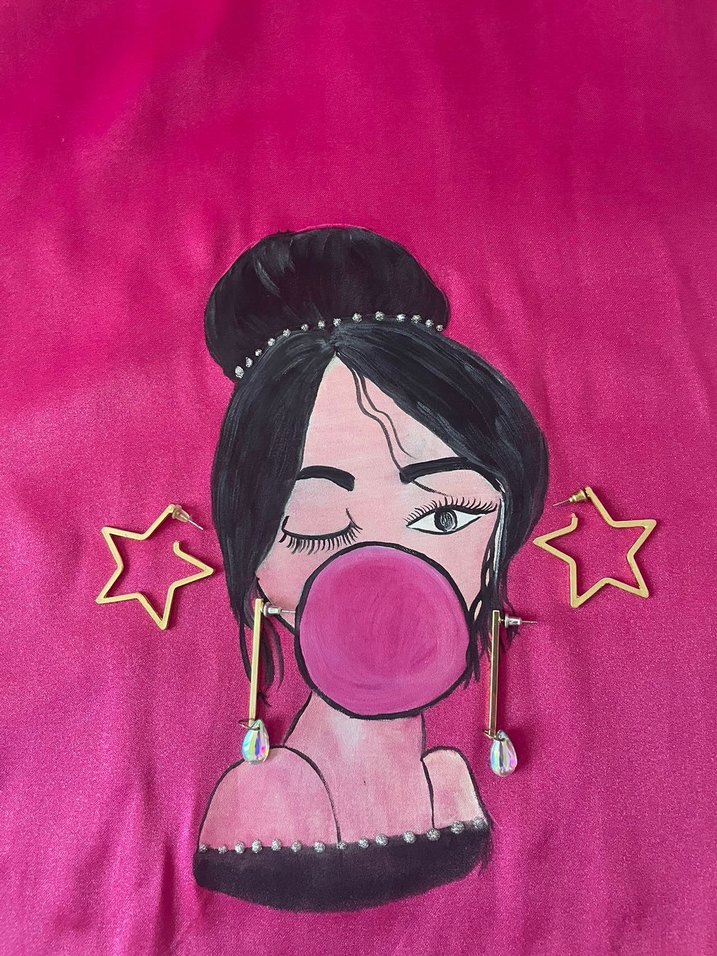 Pembe yıldız şeklinde, kabarık ve uzun sallantılı tasarıma sahip kadın küpeleri. Grunge punk ve rock punk havasıyla pastel renklerde pop kültür tarzı.