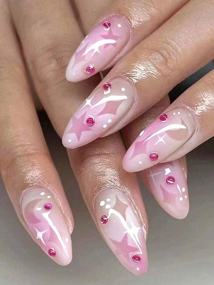 120 TL fiyatı Pastel pembe tırnak süslemeleri, yıldız desenleri ve küçük taşlarla zarif bir görünüm sunar.12 li yapıştırıcısı mevcut