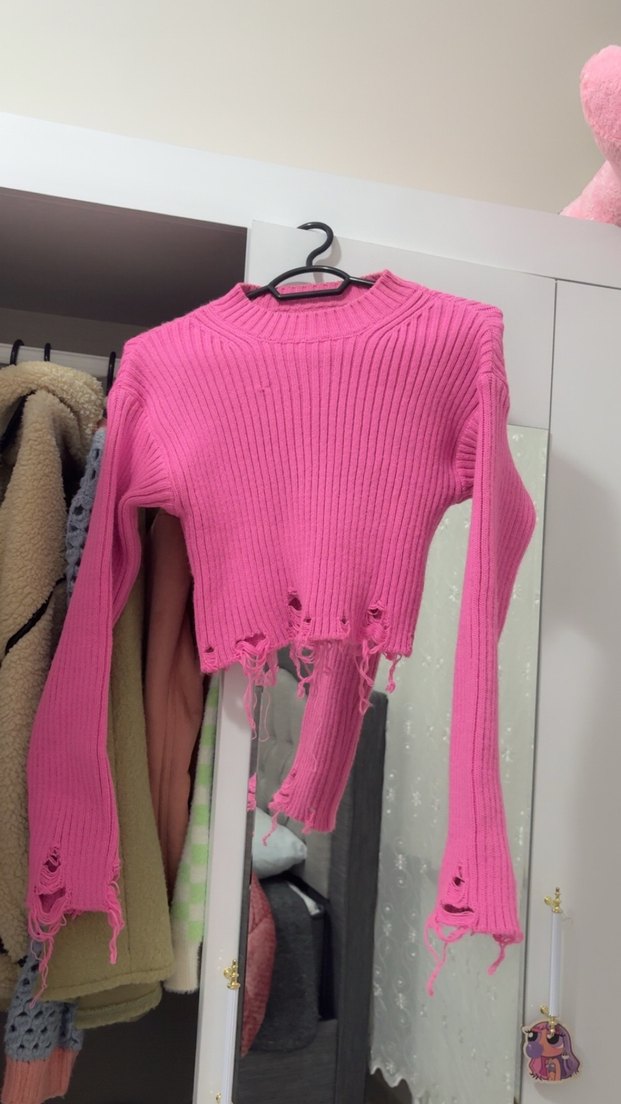 Yüksek yakalı, uzun kollu ve pembe renkli bu örgü kazak, yırtık detaylarıyla trend bir günlük tarz sunar.